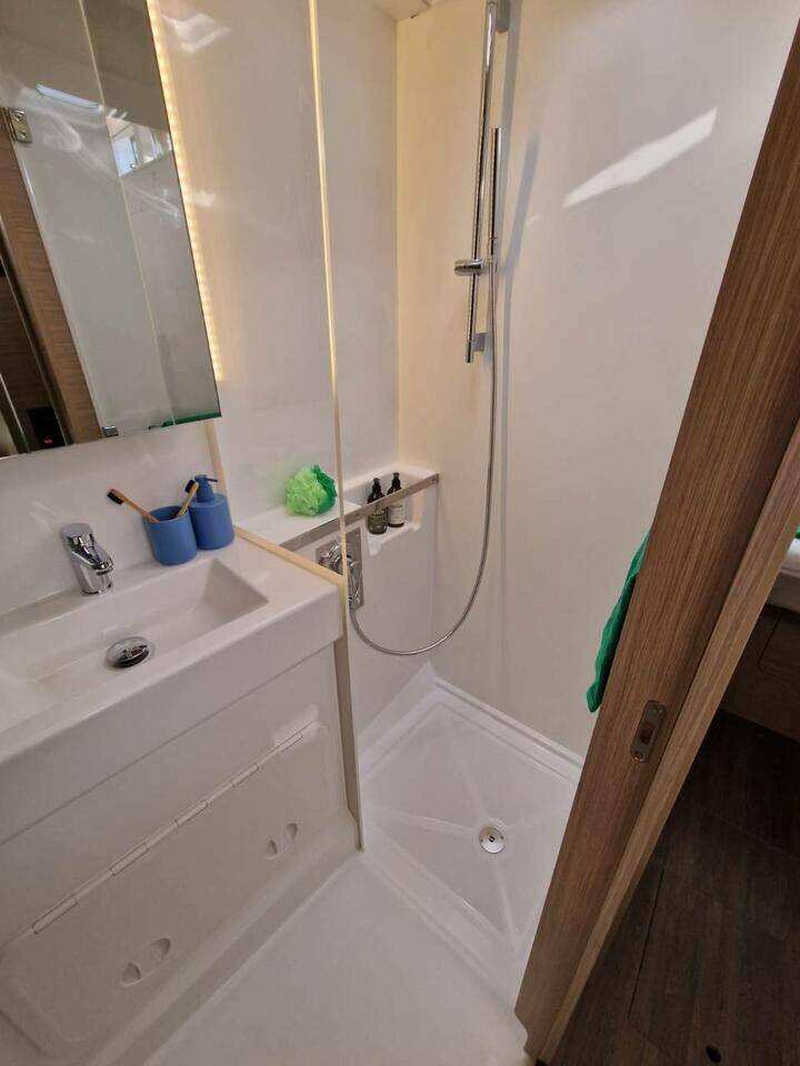 Katamaran Lagoon 38 Doudou, Baujahr 2025, liegt im Guadeloupe, La Marina Bas du Fort, Guadeloupe, Karibik vor Anker. Es verfügt über 4 + 2 Kabinen und bietet Platz für 8 + 2 Personen mit 2 Toiletten. Bettwäsche und Küchenausstattung sind im Preis inbegriffen.