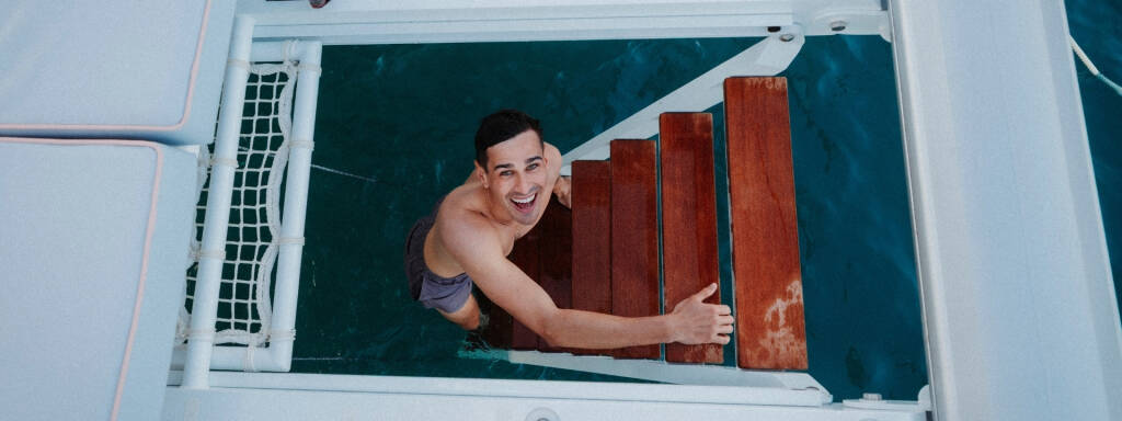 Verlängerte Sonnenpolster über dem Trampolin und eine neue Badeleiter im Bug für einen leichteren Zugang zum Meer.