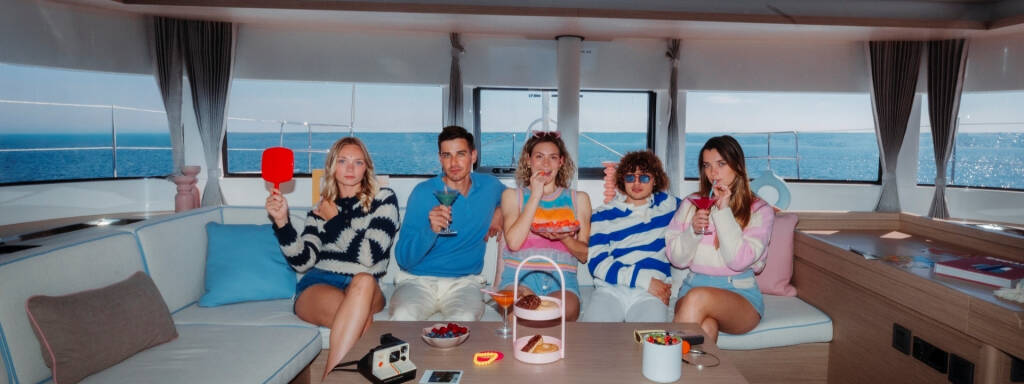 Lagoon 51 “Iconic” NEW Identität mit pastellfarbenen, von den 80ern inspirierten Retro-Farben, kontrastierenden Details und exklusiven Grafiken von Garage Yacht Design.