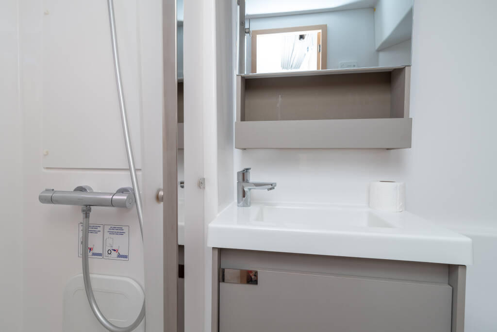Catamaran Fountaine Pajot Aura 51 Ingrid, built in 2025 is anchored in the St. Martin, Simpson Bay Marina, St. Martin, Caribbean. It has 5 cabins, can accommodate 10 + 2 people and has 5 toilets. Bed linen and kitchen equipment are included in the price.