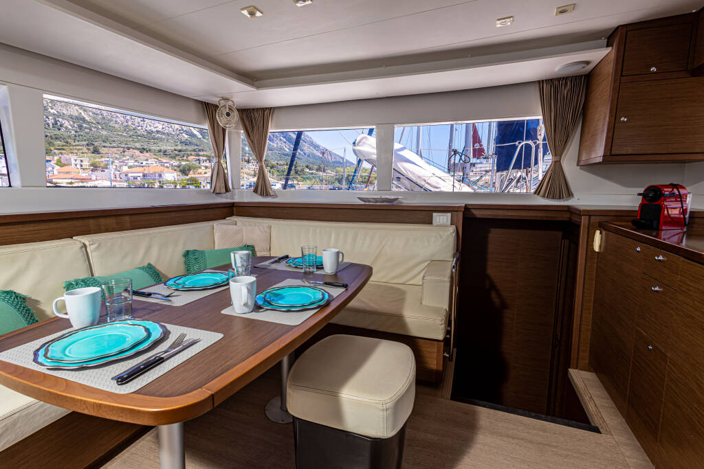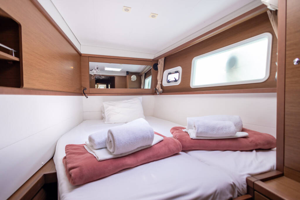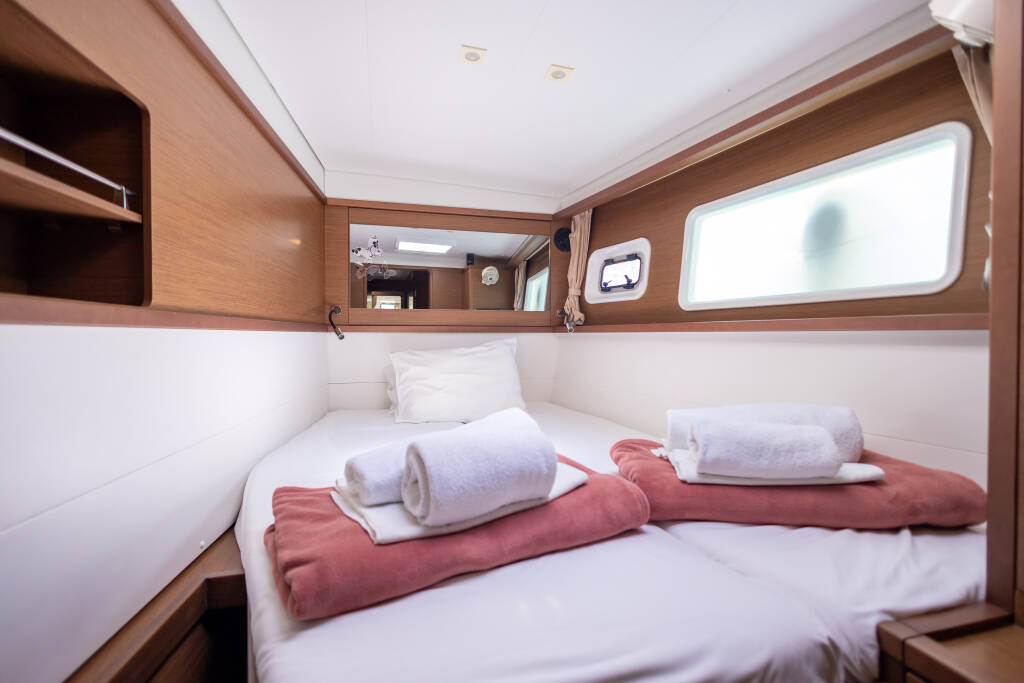 Lagoon 450 F Mary One 25/04/2026 - 02/05/2026 Home Back to Search Results Lagoon 450 F Mary One Catamaran Lagoon 450 F Mary One, built in 2019 is anchored in the Palairos, Ionian Islands, Greece. It has 4 + 2 cabins, can accommodate 8 + 2 + 2 people and has 4 + 1 toilets. Bed linen and kitchen equipment are included in the price. Highlights Stand up paddle (SUP) - FREE Refundable Security Deposit Policy A refundable security deposit applies only if the client provides valid charter deposit insurance either from an external insurance company or from client’s broker, maximum one week before the start of the charter. Accepted examples include: Pantaeunius - https://www.pantaenius.com/de-en/ Yachtpool - https://yacht-pool.com/last-minute-en/?partner=mgyachts In all other cases, a non-refundable deposit is mandatory. Download PDF Yacht ID 904 Charter Bases Palairos, Greece Charter Types Catamaran Yacht brand Lagoon Yacht Model Lagoon 450 F Yacht name Mary One Production year 2019 Number of rudder blades 2 Propulsion type SAILDRIVE Length 46 ft Beam 26 ft Draft 2.63 m Engine 2 x 57 hp Cabins 4 + 2 Berths 8 + 2 + 2 Max Persons 12 WC/Shower 4 + 1 Fuel tank 1050 l Water tank 700 l Equipment Comfort Blankets Cockpit cushions Pillows Sheets Towels Deck Anchor with chain Bilge pump - Mechanic Bimini top Black ball Boat hook Camera Canister for water Cockpit table Dinghy Dinghy (byboat) pump Electric anchor windlass Fenders Fuel funnel Hydraulic gangway Jerry cans for diesel Mooring ropes Outboard engine Plastic bucket Repair box for dinghy Spare anchor (Reserve, Auxiliary anchor) Sprayhood Swimming ladder Winch handles Entertainment LCD TV Outdoor speakers Stand up paddle (SUP) - FREE Galley Additional fridge Gas bottles Ice maker Kitchen utensils (Galley equipment, cutlery) Microwave NESPRESSO coffee machine Oven Refrigerator Stove Interior Bilge pump handle Convertible table Yacht documents Navigation Compass Divider, nautic chart Echosounder/Depthsounder GPS chart plotter - cockpit Hand bearing compass Parallel ruler Pilot book Radar reflector Speedometer (Speed log) Wind instrument/Anemometer Safety Emergency tiller Engine spare parts Fire extinguisher First aid kit Floating light Fog horn Horseshoe lifebuoy Life belts (Safety harness) Life jackets Liferaft Oars (Paddles) Repair kit Set of tools Torch Sails Electric winch Yacht electrics 220V socket Air Conditioning Batteries Battery charger Generator Inverter Solar panels Watermaker - desalinator Services Generator (Obligatory) 0 € Option 1 - Free of charge 8 hours per day, any additional hour comes with a cost of 10 euros per hour. Option 2 - Unlimited use for 200 euros per week. Payable on the spot with cash. - Payable at the base per hour Generator (Obligatory) 0 € Option 1 - Free of charge 8 hours per day, any additional hour comes with a cost of 10 euros per hour. Option 2 - Unlimited use for 200 euros per week. Payable on the spot with cash. - Payable at the base per hour Starter pack (Obligatory) 450 € End cleaning, 1x Cooking gas, Water, Linen 1 set (2 sheets, 1 pillow case, 1 bath towel, 1 face towel) per person, Harbour fees for the first & last night. * If there is pet on board, then double cleaning will be applied.; Payable on the spot with cash Α bag with Greek Local Products is offered to all of our charters as a welcome gift. - Payable at the base per booking Starter pack (Obligatory) 450 € End cleaning, 1x Cooking gas, Water, Linen 1 set (2 sheets, 1 pillow case, 1 bath towel, 1 face towel) per person, Harbour fees for the first & last night. * If there is pet on board, then double cleaning will be applied.; Payable on the spot with cash Α bag with Greek Local Products is offered to all of our charters as a welcome gift. - Payable at the base per booking Cook 200 € (Crew require their own cabin); Only responsible for daily cooking / provisioning and cleaning relevant to kitchen area; Payable on the spot with cash; Crew Cancellation Policy A Down payment of 25% is required upon confirmation, and the rest are payable on the spot with cash. Crew cancelled 4 weeks prior to embarkation will have 25% of total crew fee applicable. Crew cancelled less than 14 days prior to embarkation will have 100% of the total crew fee applicable. - Payable at the base per day + food Cook 200 € (Crew require their own cabin); Only responsible for daily cooking / provisioning and cleaning relevant to kitchen area; Payable on the spot with cash; Crew Cancellation Policy A Down payment of 25% is required upon confirmation, and the rest are payable on the spot with cash. Crew cancelled 4 weeks prior to embarkation will have 25% of total crew fee applicable. Crew cancelled less than 14 days prior to embarkation will have 100% of the total crew fee applicable. - Payable at the base per day + food Crew change 150 € Payable on the spot with cash Applicable only at one of our bases: Included : Formalities (contract, crew list, etc.) and one day of mooring fees. Not included: Yachts cleaning and laundry. - Payable at the base per booking Crew change 150 € Payable on the spot with cash Applicable only at one of our bases: Included : Formalities (contract, crew list, etc.) and one day of mooring fees. Not included: Yachts cleaning and laundry. - Payable at the base per booking Early boarding/check-in 200 € Access to the yacht by 14:00 In the event of delay beyond our control refunds will be made.; Payable on the spot with cash - Payable at the base per booking Early boarding/check-in 200 € Access to the yacht by 14:00 In the event of delay beyond our control refunds will be made.; Payable on the spot with cash - Payable at the base per booking Hostess 190 € *crew require their own cabin; Payable on the spot with cash Crew Cancellation Policy A Down payment of 25% is required upon confirmation, and the rest are payable on the spot with cash. Crew cancelled 4 weeks prior to embarkation will have 25% of total crew fee applicable. Crew cance