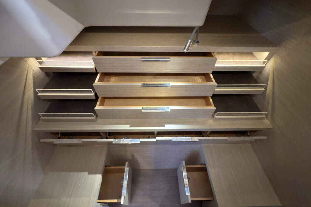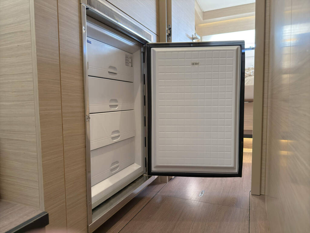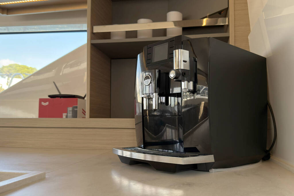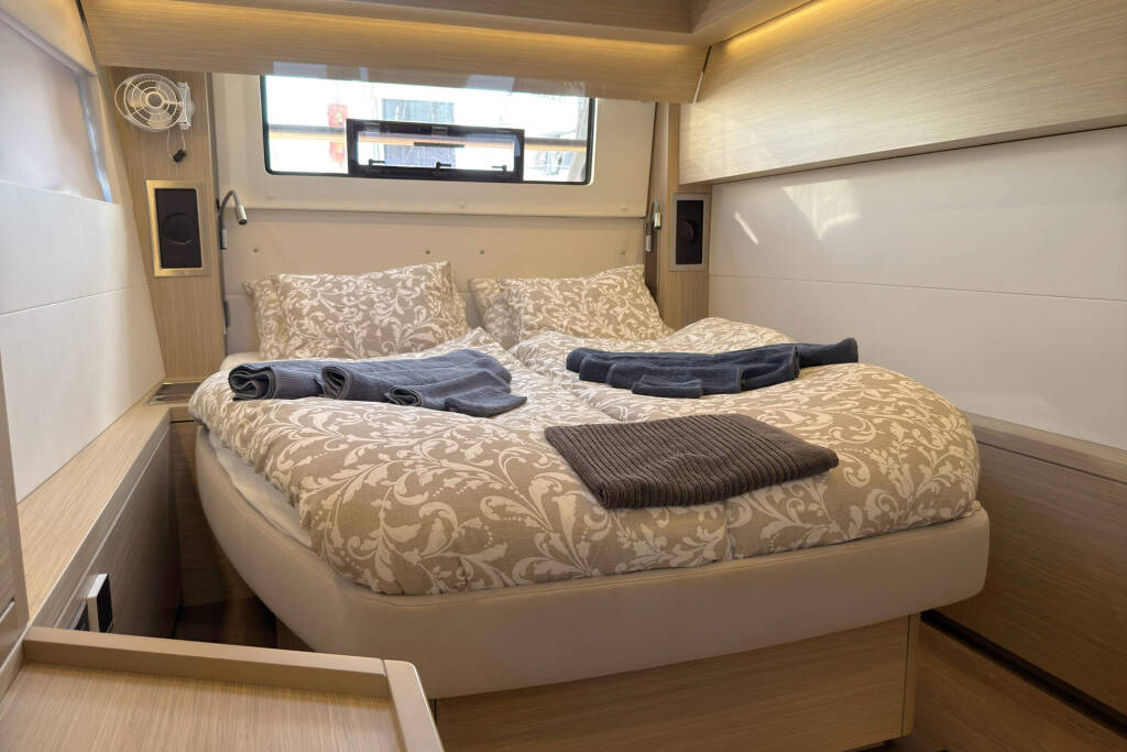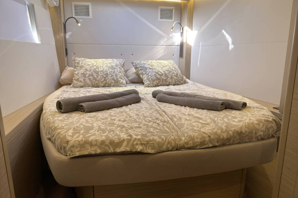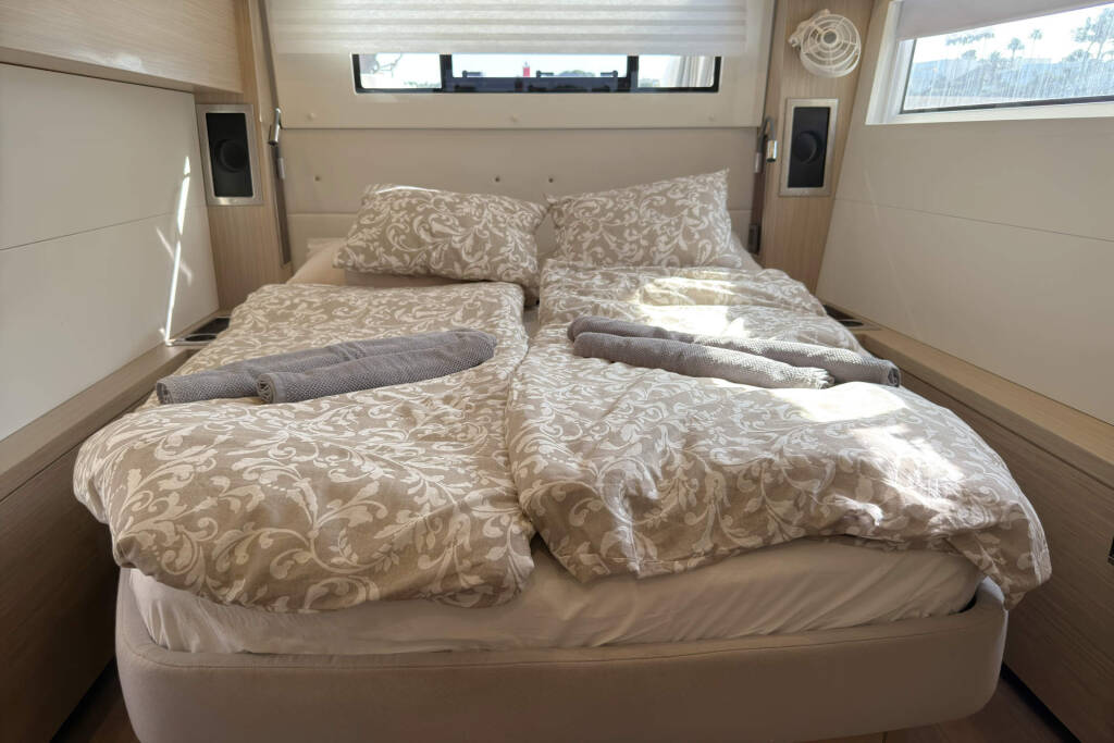 Skipper cabin in the bow on the port side, fans in the saloon and in the cabins, 80L refrigerator in the rear cockpit, electric anchor winch with remote control at the helm with chain counter, carpet in the cabins and in the saloon, cockpit cushions in the rear cockpit and in the front cockpit, cushions for the sunbathing area on the flybridge, electric Harken winches on the flybridge, square top mainsail, electric lifting system for dinghy, flexiteak in the rear cockpit and in the front cockpit, removable cockpit bench with cushions, tarpaulin for the rear cockpit with windows, flybridge, bimini window and windbreak, side panels with window for bimini, electric engine control at the helm, large front sliding window on the roof, 110L freezer, curtains in the cabins, slatted frame in the aft cabins and foreship cabin, flexible solar panel approx. 2200 watts, Webasto V50M air conditioning in all cabins, watermaker - can be operated from the chart table in the saloon 200 liters/h, alarm system, blue underwater lighting, camera for bird view, LTE router, gangway from Swi-Tec 3 m x 0.44 m wide, dinghy with 50 HP Honda engine, stainless steel structure over David for solar, skipper's cabin with 230 volt socket, flybridge 230 volt sockets, ice cube machine, washing machine and dryer in one device, dishwasher, microwave and oven, Caeran hob, tap for drinking water and sparkling water chilled, water filter for drinking water in the port engine compartment for water and ice, Kärcher high-pressure cleaner in anchor box, pressureless connection to the water tank, 40 inch TV with wall bracket, JURA fully automatic coffee machine, Weber grill with 10 m extension cable, electric air pump, loudspeaker in the front cockpit with connection to the sound system, inverter Mastervolt 12 volt to 220 volt 6000 watt, hydraulic bathing platform