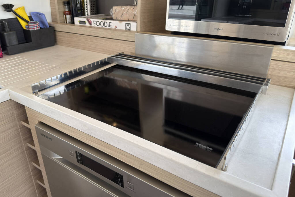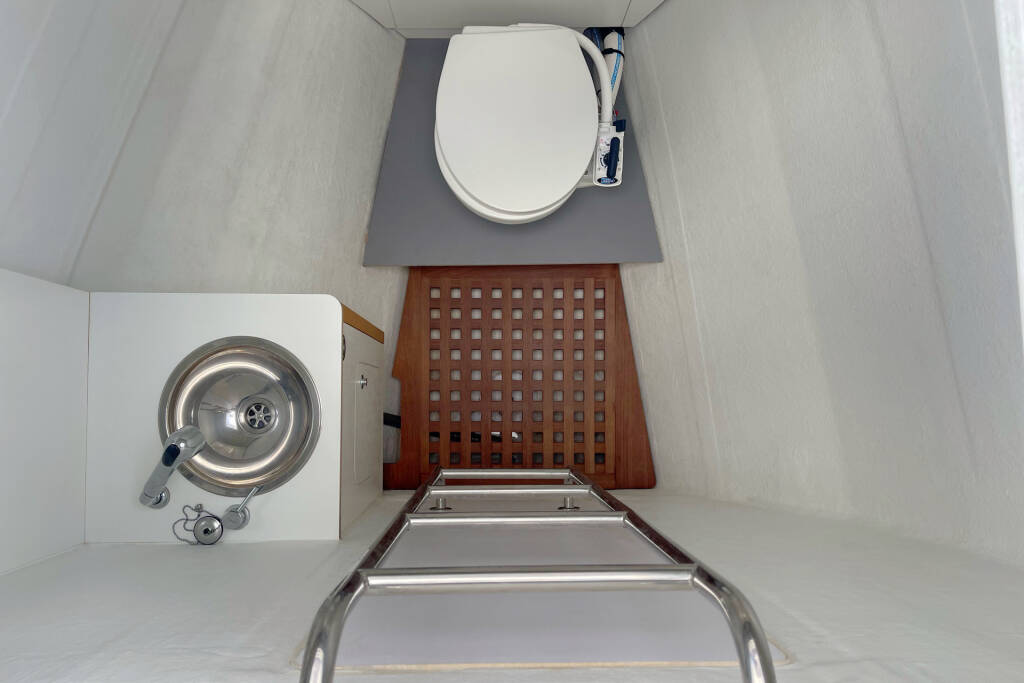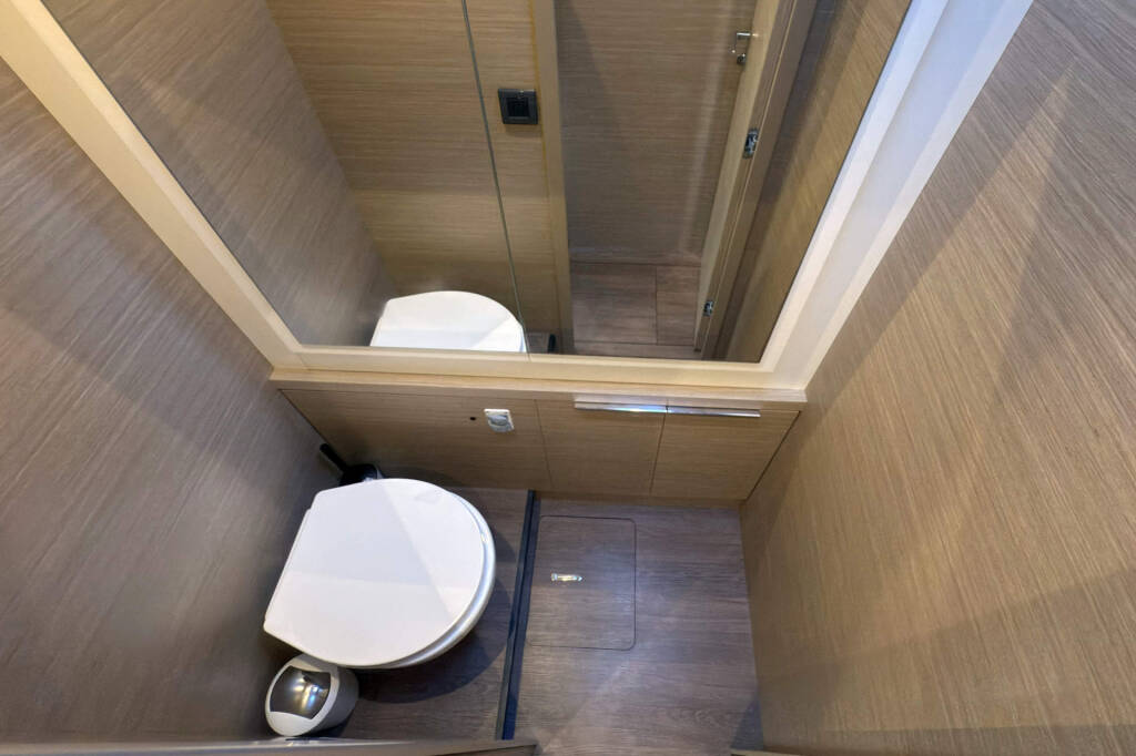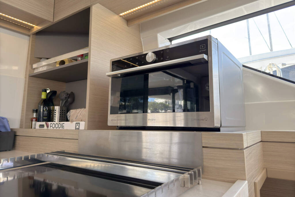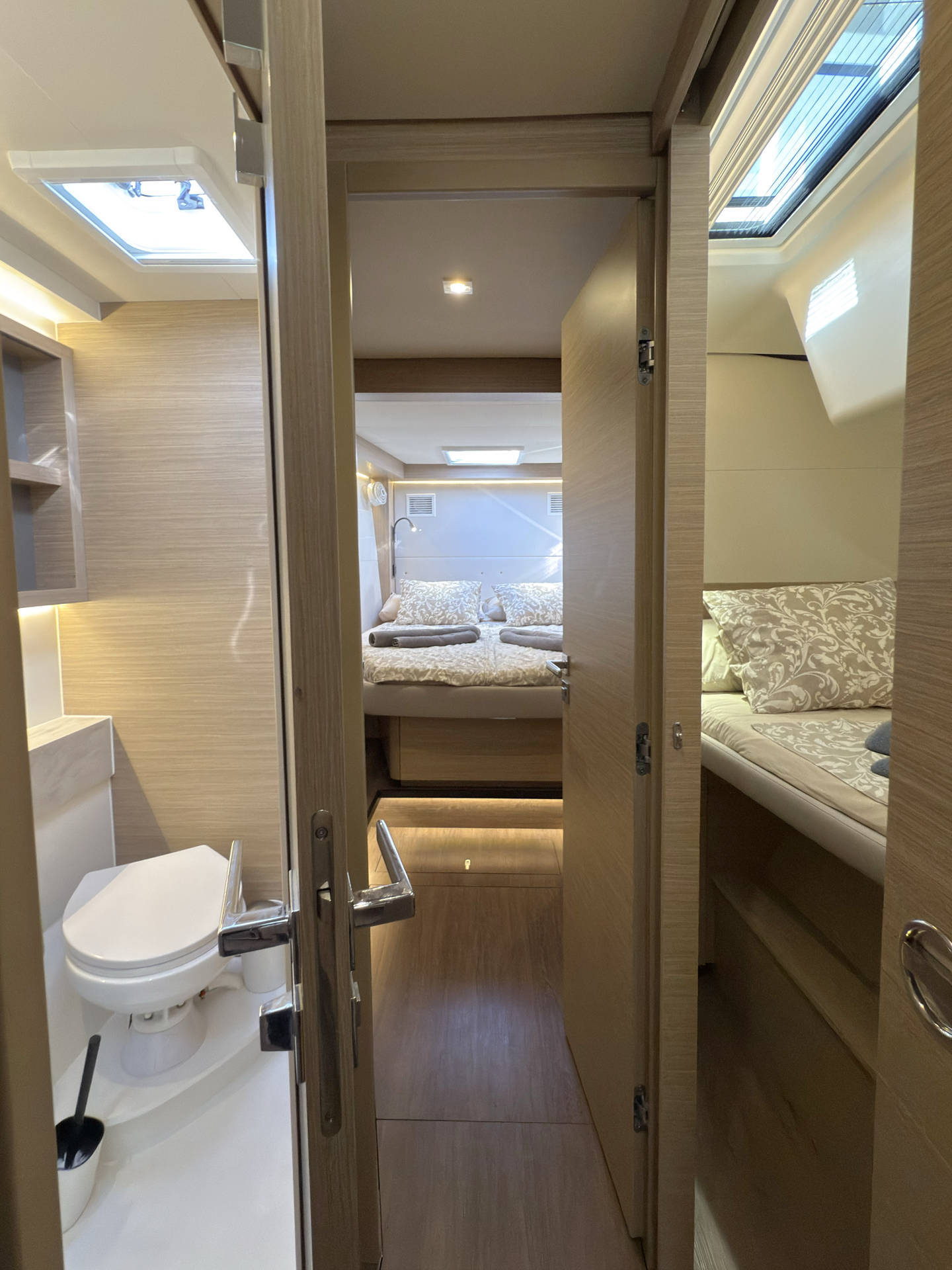 Skipper cabin in the bow on the port side, fans in the saloon and in the cabins, 80L refrigerator in the rear cockpit, electric anchor winch with remote control at the helm with chain counter, carpet in the cabins and in the saloon, cockpit cushions in the rear cockpit and in the front cockpit, cushions for the sunbathing area on the flybridge, electric Harken winches on the flybridge, square top mainsail, electric lifting system for dinghy, flexiteak in the rear cockpit and in the front cockpit, removable cockpit bench with cushions, tarpaulin for the rear cockpit with windows, flybridge, bimini window and windbreak, side panels with window for bimini, electric engine control at the helm, large front sliding window on the roof, 110L freezer, curtains in the cabins, slatted frame in the aft cabins and foreship cabin, flexible solar panel approx. 2200 watts, Webasto V50M air conditioning in all cabins, watermaker - can be operated from the chart table in the saloon 200 liters/h, alarm system, blue underwater lighting, camera for bird view, LTE router, gangway from Swi-Tec 3 m x 0.44 m wide, dinghy with 50 HP Honda engine, stainless steel structure over David for solar, skipper's cabin with 230 volt socket, flybridge 230 volt sockets, ice cube machine, washing machine and dryer in one device, dishwasher, microwave and oven, Caeran hob, tap for drinking water and sparkling water chilled, water filter for drinking water in the port engine compartment for water and ice, Kärcher high-pressure cleaner in anchor box, pressureless connection to the water tank, 40 inch TV with wall bracket, JURA fully automatic coffee machine, Weber grill with 10 m extension cable, electric air pump, loudspeaker in the front cockpit with connection to the sound system, inverter Mastervolt 12 volt to 220 volt 6000 watt, hydraulic bathing platform