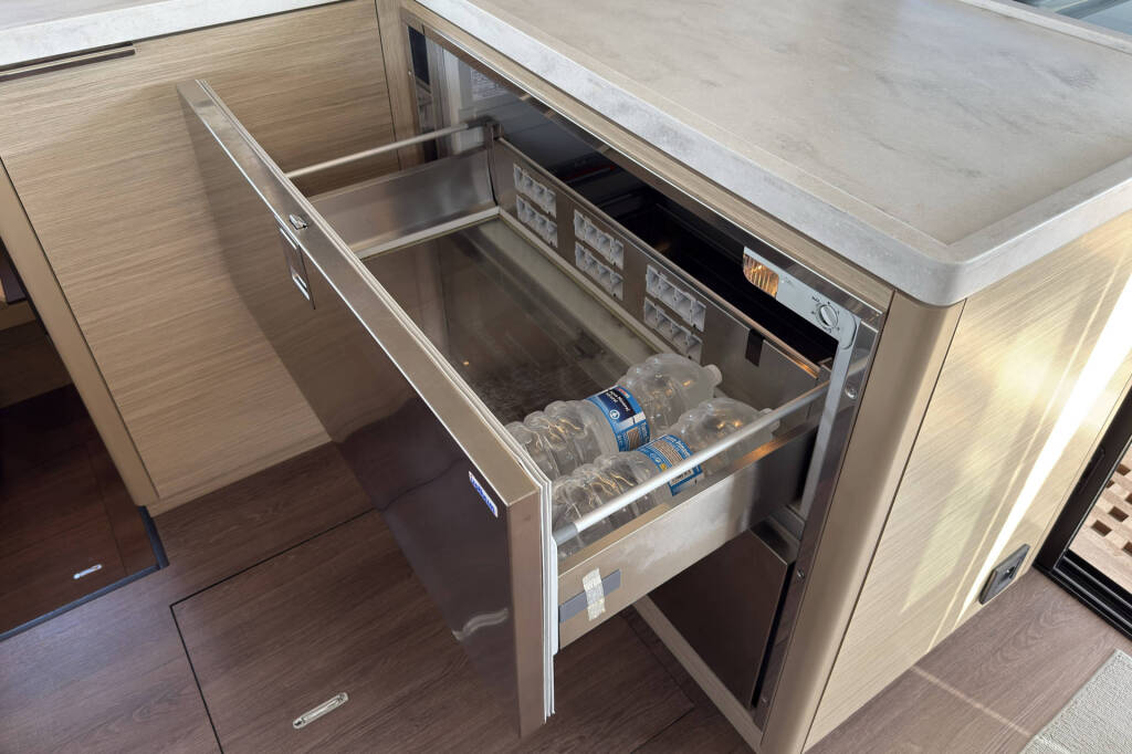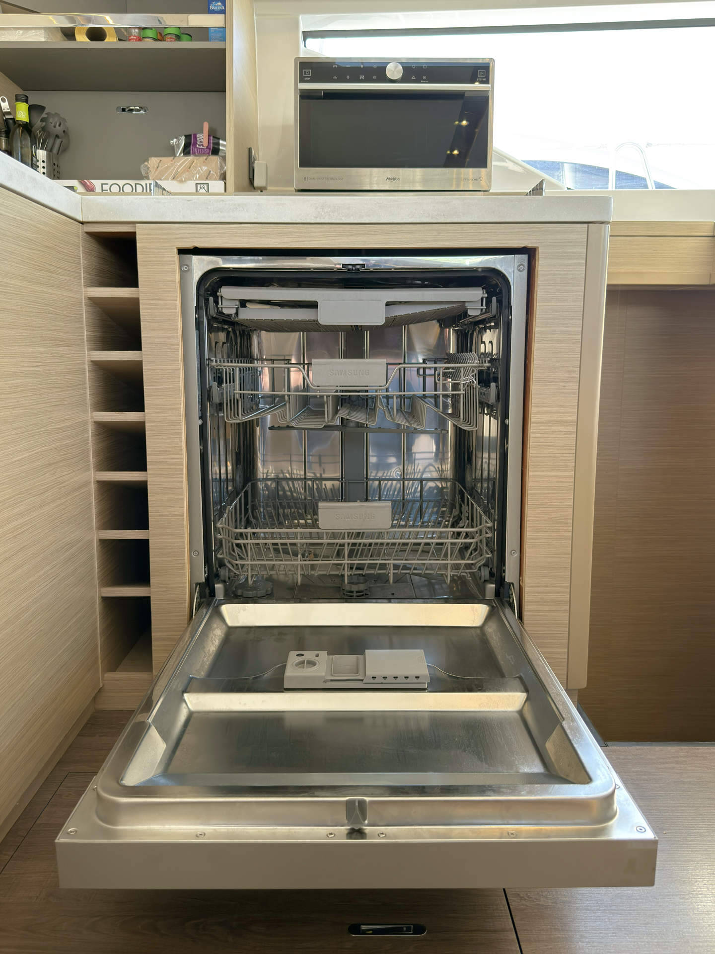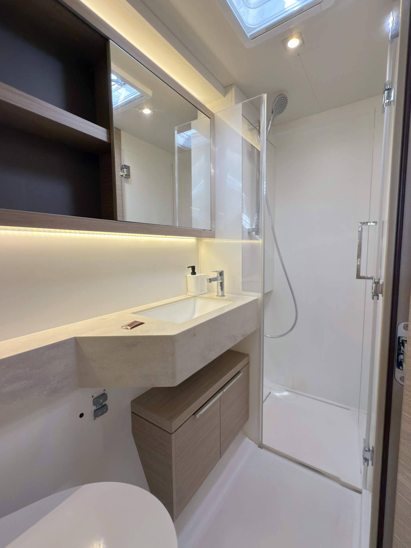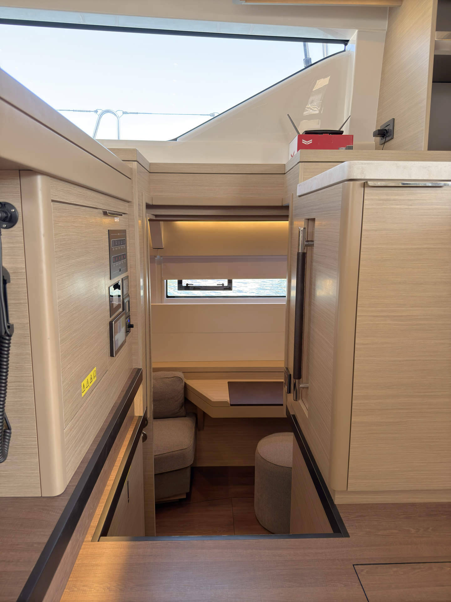 Skipper cabin in the bow on the port side, fans in the saloon and in the cabins, 80L refrigerator in the rear cockpit, electric anchor winch with remote control at the helm with chain counter, carpet in the cabins and in the saloon, cockpit cushions in the rear cockpit and in the front cockpit, cushions for the sunbathing area on the flybridge, electric Harken winches on the flybridge, square top mainsail, electric lifting system for dinghy, flexiteak in the rear cockpit and in the front cockpit, removable cockpit bench with cushions, tarpaulin for the rear cockpit with windows, flybridge, bimini window and windbreak, side panels with window for bimini, electric engine control at the helm, large front sliding window on the roof, 110L freezer, curtains in the cabins, slatted frame in the aft cabins and foreship cabin, flexible solar panel approx. 2200 watts, Webasto V50M air conditioning in all cabins, watermaker - can be operated from the chart table in the saloon 200 liters/h, alarm system, blue underwater lighting, camera for bird view, LTE router, gangway from Swi-Tec 3 m x 0.44 m wide, dinghy with 50 HP Honda engine, stainless steel structure over David for solar, skipper's cabin with 230 volt socket, flybridge 230 volt sockets, ice cube machine, washing machine and dryer in one device, dishwasher, microwave and oven, Caeran hob, tap for drinking water and sparkling water chilled, water filter for drinking water in the port engine compartment for water and ice, Kärcher high-pressure cleaner in anchor box, pressureless connection to the water tank, 40 inch TV with wall bracket, JURA fully automatic coffee machine, Weber grill with 10 m extension cable, electric air pump, loudspeaker in the front cockpit with connection to the sound system, inverter Mastervolt 12 volt to 220 volt 6000 watt, hydraulic bathing platform